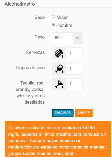 Para usarla es necesario ingresar los datos de sexo, peso y cantidad de copas ingeridas.
