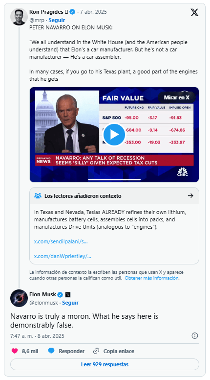 Navarro, en una entrevista posterior con CNBC, afirmó que las críticas no le sorprendían viniendo del director ejecutivo de Tesla, ya que era un “ensamblador de automóviles” que utilizaba piezas de otros países.