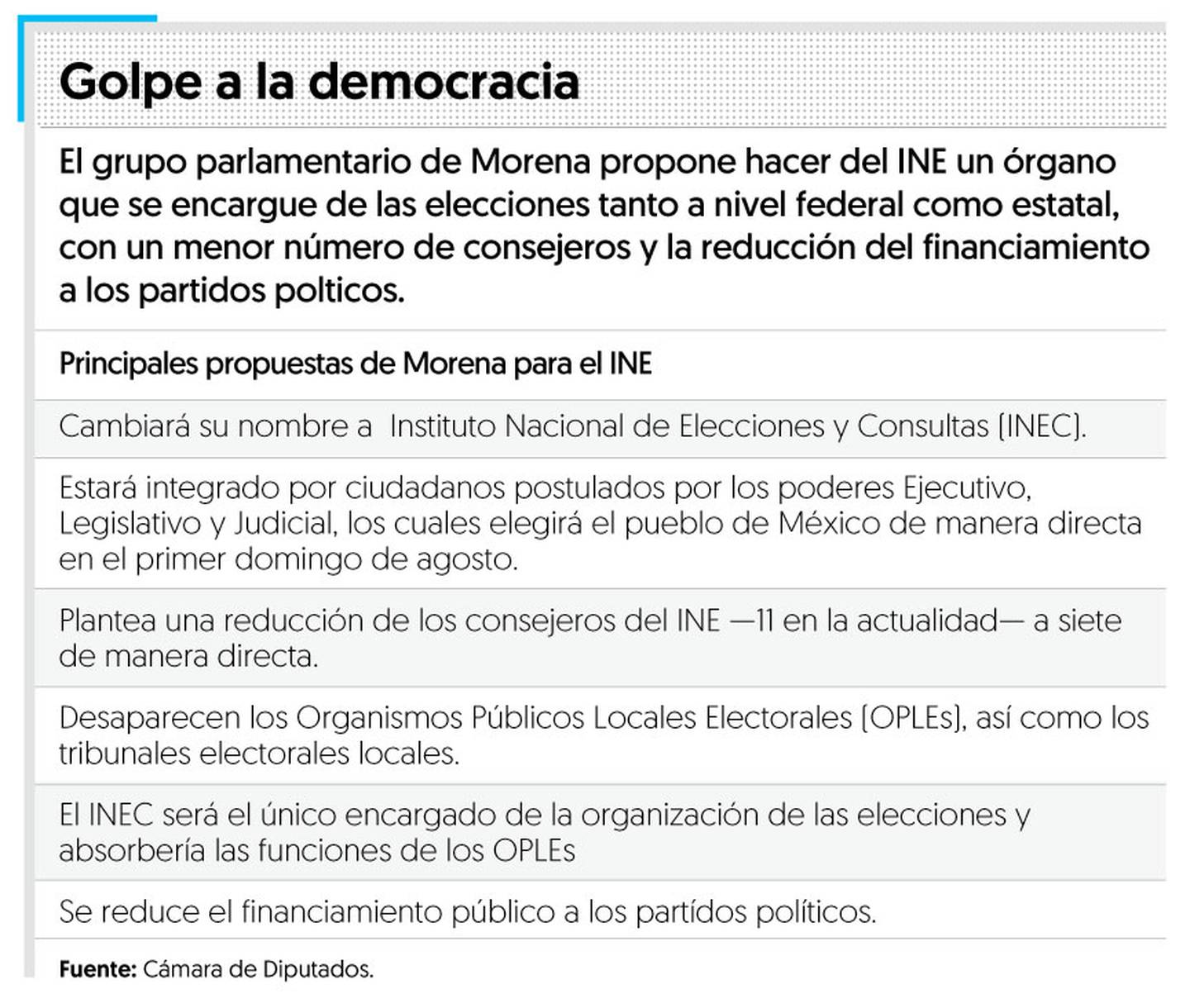 Entre los principales cambios que el partido Morena solicita que se hagan al INE, se encuentran la reducción del número de consejeros, de 11 con los que cuenta actualmente, a siete, mismos que serán elegidos por el pueblo, a propuesta de los tres poderes de la Unión.