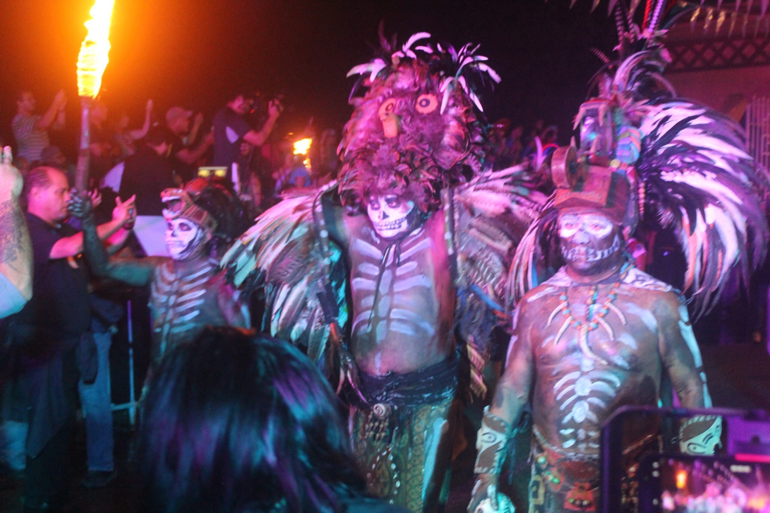 El Desfile estuvo encabezado por un sacerdote maya en conjunto de bailarines mayas, así como la representación del búho, el pájaro de la muerte, quienes con fuego de sus antorchas y olor del incienso purifican el paso de los difuntos hacia nuestro mundo.