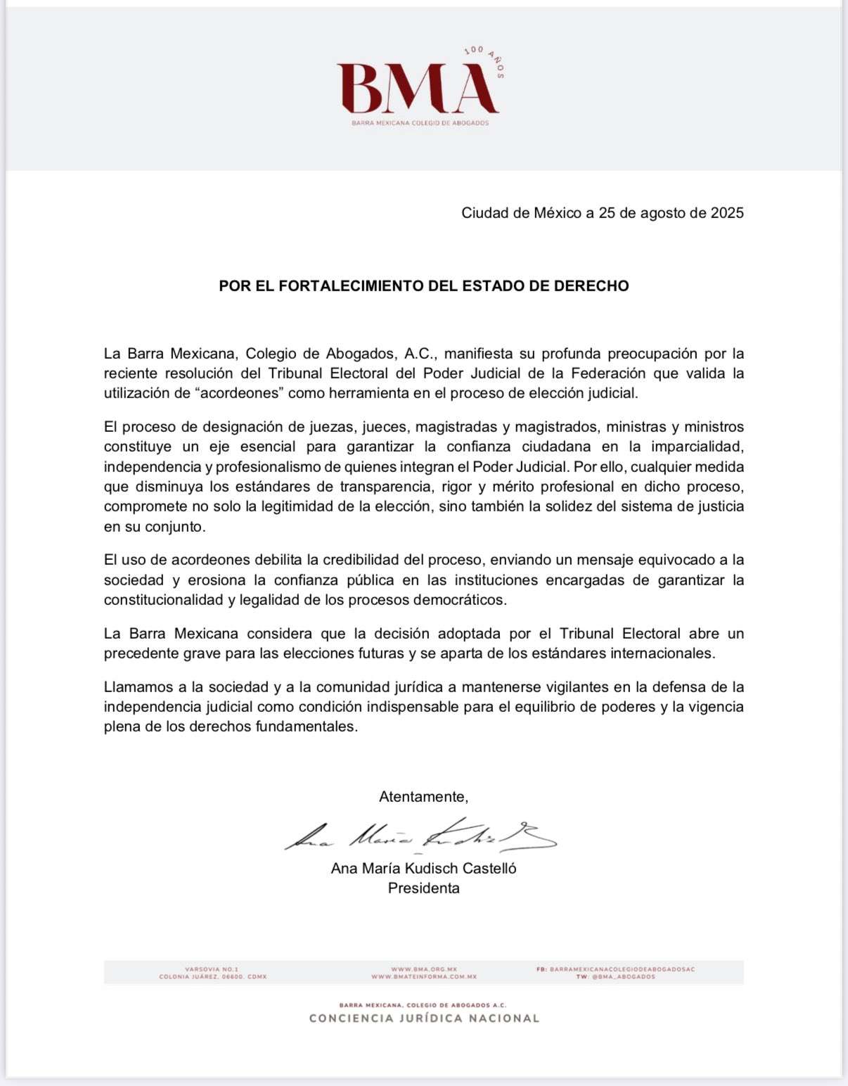 La Barra Mexicana, Colegio de Abogados, A.C., lamentó que el Tribunal Electoral del Poder Judicial de la Federación (TEPJF) declarara la validez de la elección judicial, a pesar del uso de acordeones.