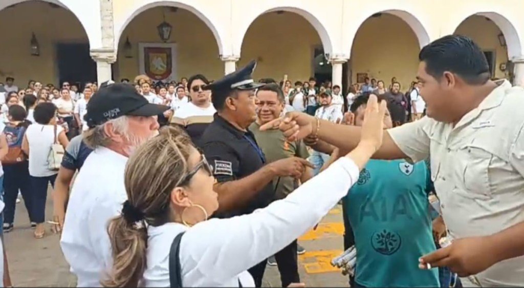 Los ánimos se caldearon cuando intervino Jesús Chablé y comenzó hablar de la Coordinadora Nacional de los Trabajadores de la Educación, lo que provocó que los otros maestros le comenzaran a gritar que no a eso salieron a protestar, y luego siguieron con “¡fuera, fuera, fuera!”, incluso uno se le acercó para pedirle que se fuera.