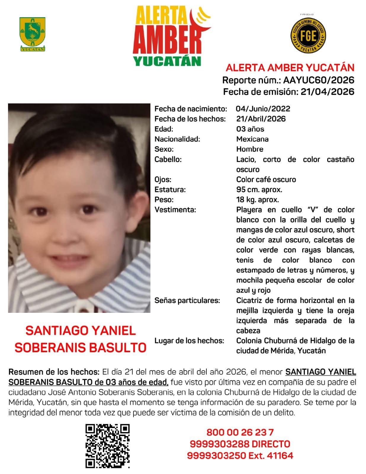 La Fiscalía General del Estado activó una Alerta Amber en Yucatán por la desaparición del menor Santiago Yaniel Soberanis Basulto, de 3 años de edad, quien fue visto por última vez en la ciudad de Mérida, lo que derivó en la emisión de un reporte oficial para su localización.