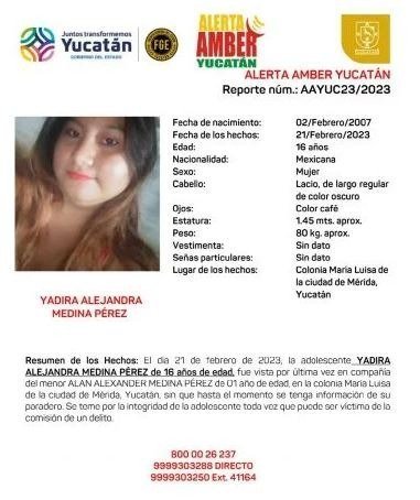 Desde el pasado 21 de febrero de este año, los menores de edad Yadira Alejandra Medina Pérez y Alan Alexander Medina Pérez se encuentran desaparecidos tras ser vistos por última vez en la colonia María Luisa, en Mérida.