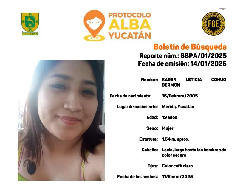 Según el resumen de los hechos: El día 11 del mes de enero del año 2025, la ciudadana Karen Leticia Cohuo Bermon de 19 años de edad, fue vista por última vez en la localidad de Molas de la ciudad de Mérida, Yucatán, sin que hasta el momento se tenga información de su paradero.