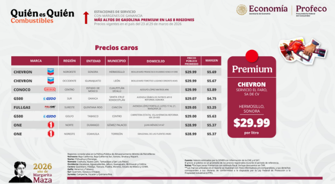 Cabe aclarar, que el programa “¿Quién es quién en los combustibles?”, fue creado para brindar información actualizada sobre las estaciones de servicio que comercializan gasolina y diésel con los precios más altos y más bajos de la República Mexicana. La clasificación se construye a partir de los precios reportados a la Comisión Reguladora de Energía (CRE) por los permisionarios de venta al público de gasolinas y diésel. (Agencia SIM)