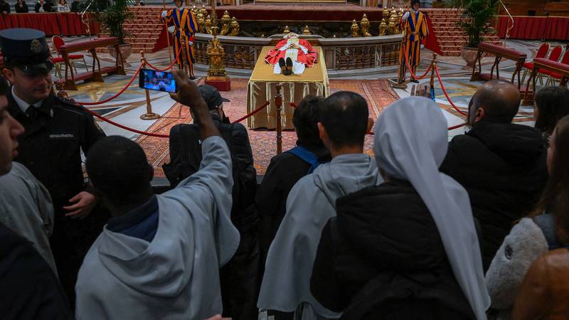 Fieles y curiosos, el público subió a paso ligero por el pasillo central para pasar junto al féretro con sus telas después de esperar en una fila que a media mañana serpenteaba alrededor de la Plaza de San Pedro.