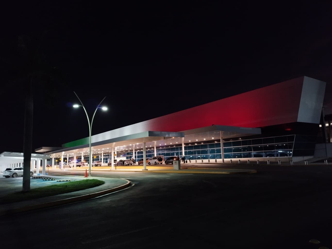 Como cada año el grupo Aeropuertos del Sureste iluminó la fachada del Aeropuerto Internacional de Mérida con los colores verde, blanco y rojo, cómo parte de la celebración del mes patrio.