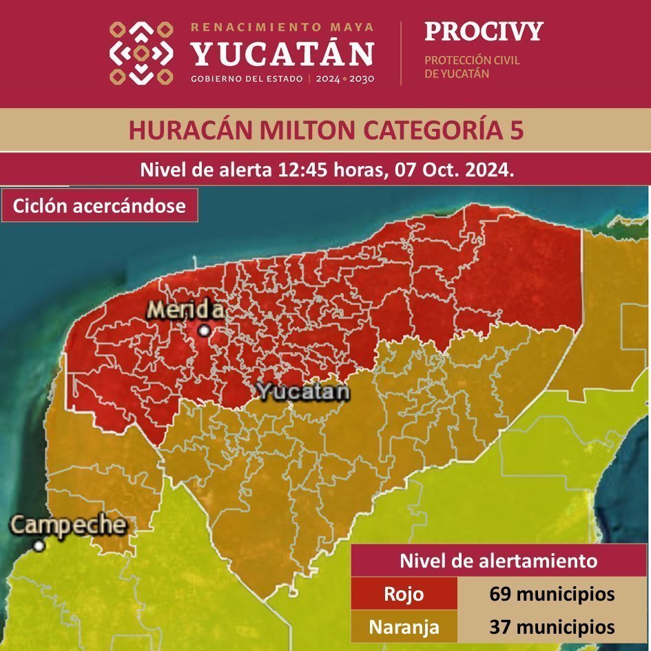 Ante ello, Protección Civil de Yucatán emitió a Alerta Roja en 69 municipios de Yucatán, cual significa peligro alto ante la cercanía de Milton y sus afectaciones. A su vez, igual se emite la Alerta Naranja en los 37 municipios restantes del estado.