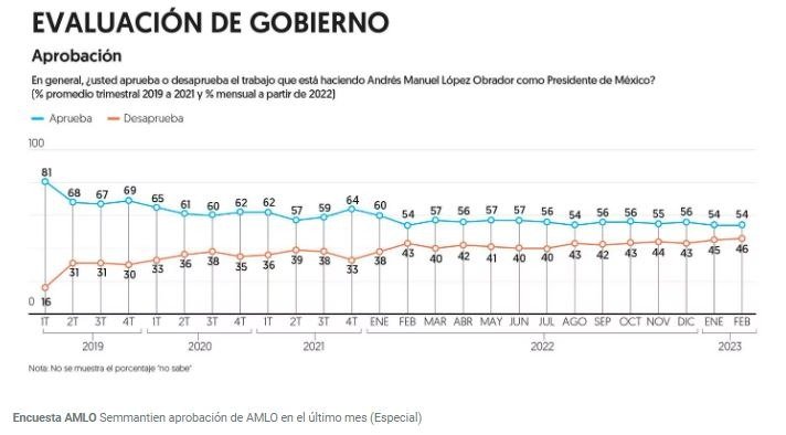 La aprobación ciudadana al presidente Andrés Manuel López Obrador registró 54 por ciento en febrero, sin variaciones respecto al mes anterior, cuando se registró la misma proporción, de acuerdo con la encuesta nacional de El Financiero.