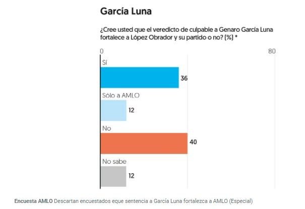 De acuerdo con la encuesta, 36 por ciento opina que el veredicto de culpable a García Luna fortalece al Presidente y a su partido; otro 12 por ciento cree que fortalece solamente al mandatario. En contraste, 40 por ciento no ve que el juicio influya en el apoyo al jefe del Ejecutivo federal o su partido político.