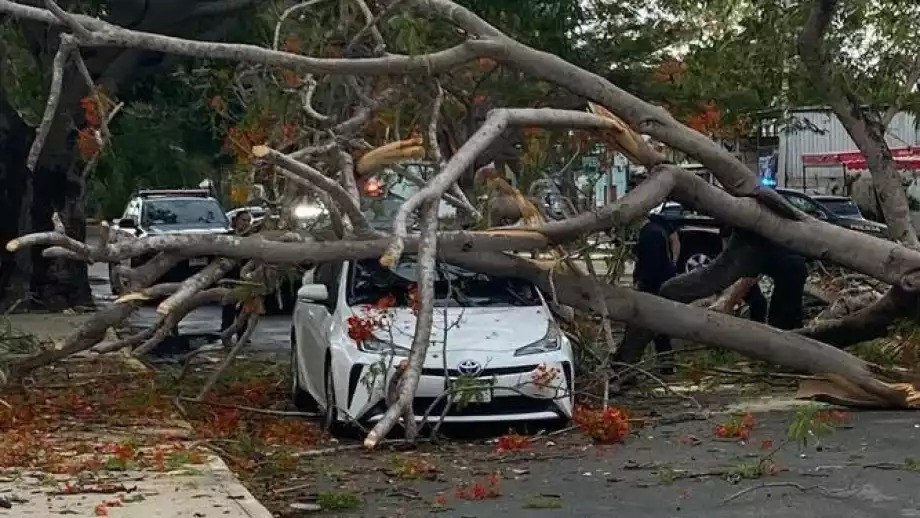 La lluvia y las fuertes rachas de viento registradas la tarde de este miércoles 18 de junio en distintos puntos de la capital yucateca, derribaron un gran árbol de flamboyán, el cual cayó sobre un vehículo que circulaba en la avenida 27 de la colonia Cordemex, localizada al norte de la ciudad.