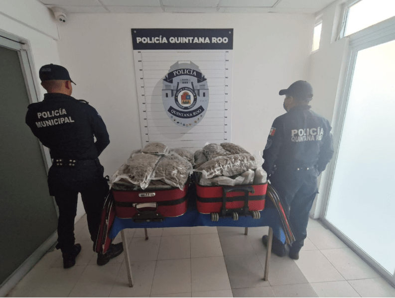 Tras una denuncia al número de emergencias 911, elementos de la Policía Quintana Roo, acudieron a la terminal de autobuses ubicada en la avenida Uxmal, en la supermanzana 23, donde les reportaron que dos hombres habían dejado abandonadas unas maletas de las cuales provenían fuertes olores, a su llegada revisaron el equipaje encontrando paquetes con marihuana.