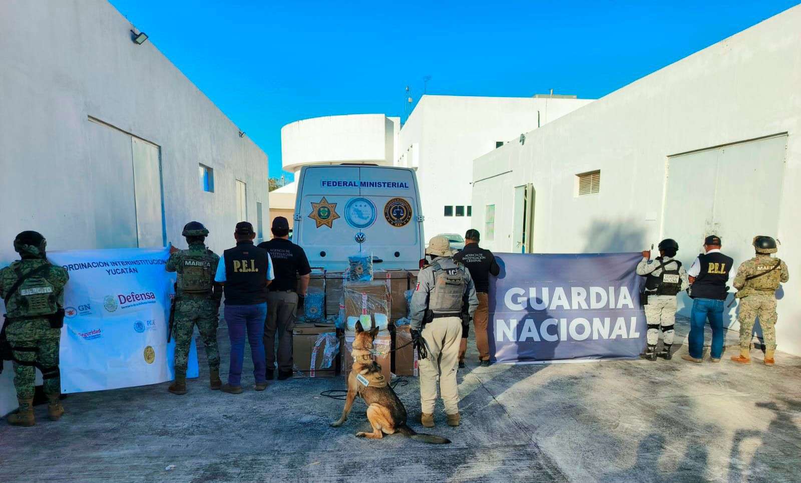 Un cargamento de más de 275 kilogramos de presunta droga fue asegurado el martes 24 de febrero de 2026 en un puesto de revisión instalado en la carretera Mérida–Cancún, a la altura de Teya, y el conductor de una unidad de paquetería fue detenido.