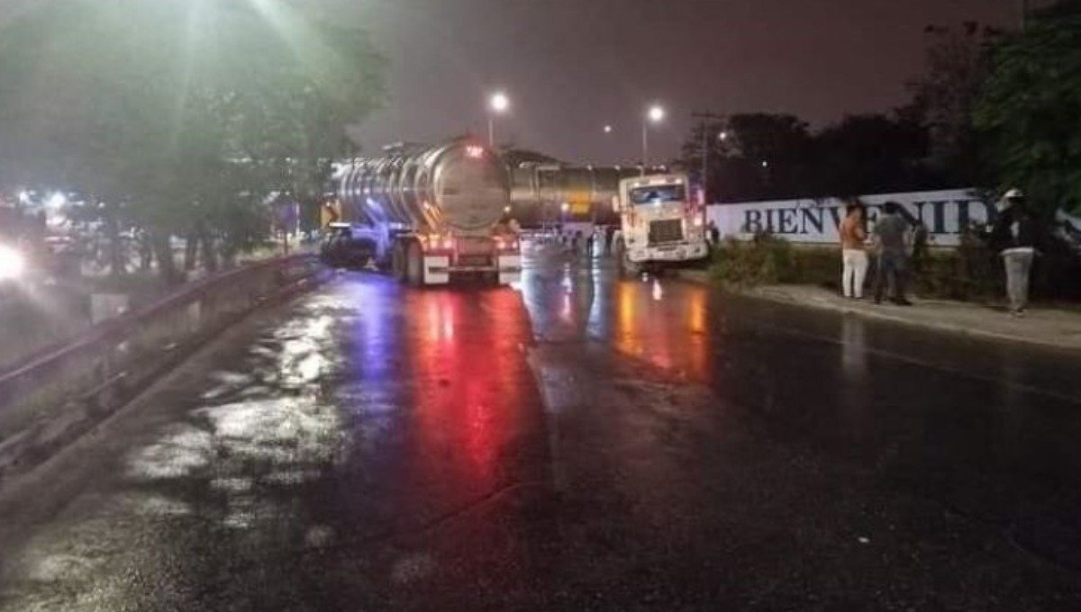 La madrugada de ayer, de acuerdo con datos obtenidos, momentos de tensión vivieron conductores en la carretera Mérida-Cancún, cuando una pipa de doble remolque repleta de combustible derrapó a consecuencia del piso mojado y embistió a un vehículo particular.