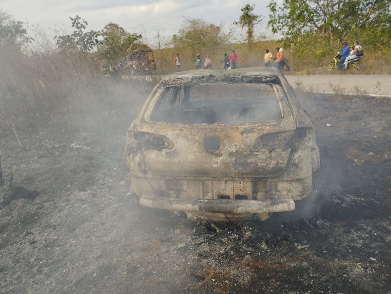 Tras sufrir un accidente, un auto terminó completamente calcinado a la orilla de la carretera Tizimín-Río Lagartos, por lo que al sitio arribaron policías estatales y bomberos para los trabajos correspondientes; sin embargo, no se encontró a nadie que reclamara dicho vehículo, por lo que quedo a disposición de la Guardia Nacional.