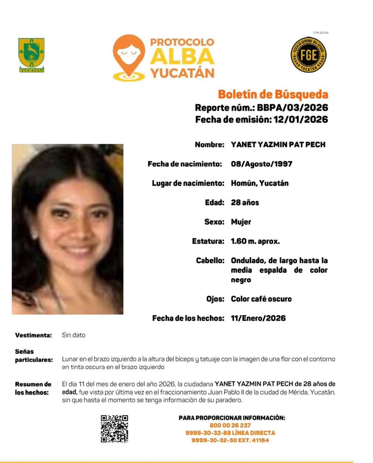 La Fiscalía General del Estado informó que se puso en marcha el Protocolo Alba Yucatán para la búsqueda de Yanet Yazmín Pat Pech, de 28 años de edad, originaria del municipio de Homún, quien fue vista por última vez en el fraccionamiento Juan Pablo II.