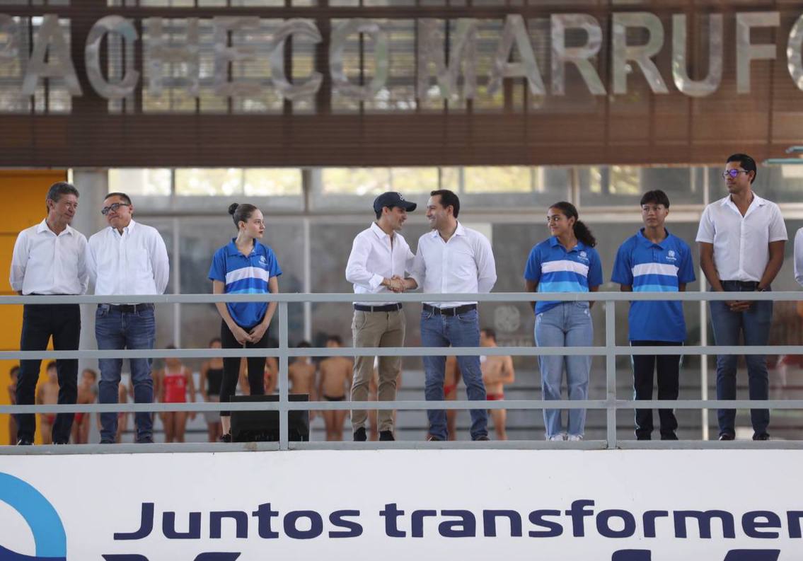 Ante las nadadoras Ana Sofía Lara Loria, Regina Palafox Jiménez y el clavadista Owen Mendieta, el Gobernador recordó que hace unas semanas hizo lo mismo con el remodelado Centro de Alto Rendimiento (CARD); este año y el siguiente, se mantendrá las intervenciones a los recintos del rubro en la entidad, a fin de ofrecer a la niñez y juventud espacios para actividades físicas.