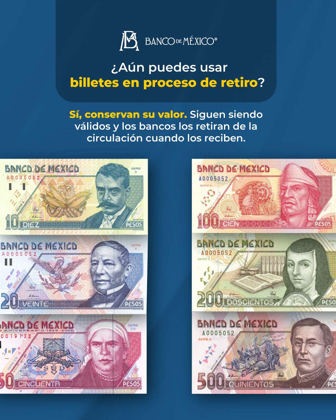 Banxico informa los billetes que están en proceso de retiro.