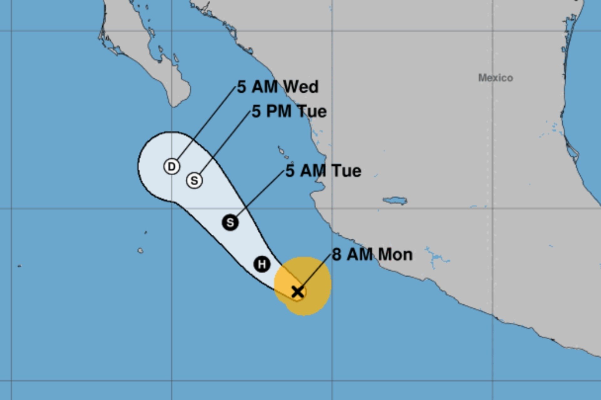 “Sus bandas y el arrastre de humedad que genera, mantienen las condiciones para lluvias muy fuertes de hasta 75 milímetros en Jalisco, Colima y Michoacán, viento de hasta 60 kilómetros por hora con rachas de hasta 80 km/h en costas de Jalisco y Colima”, explicó la autoridad en su aviso de esta mañana difundido en redes sociales.