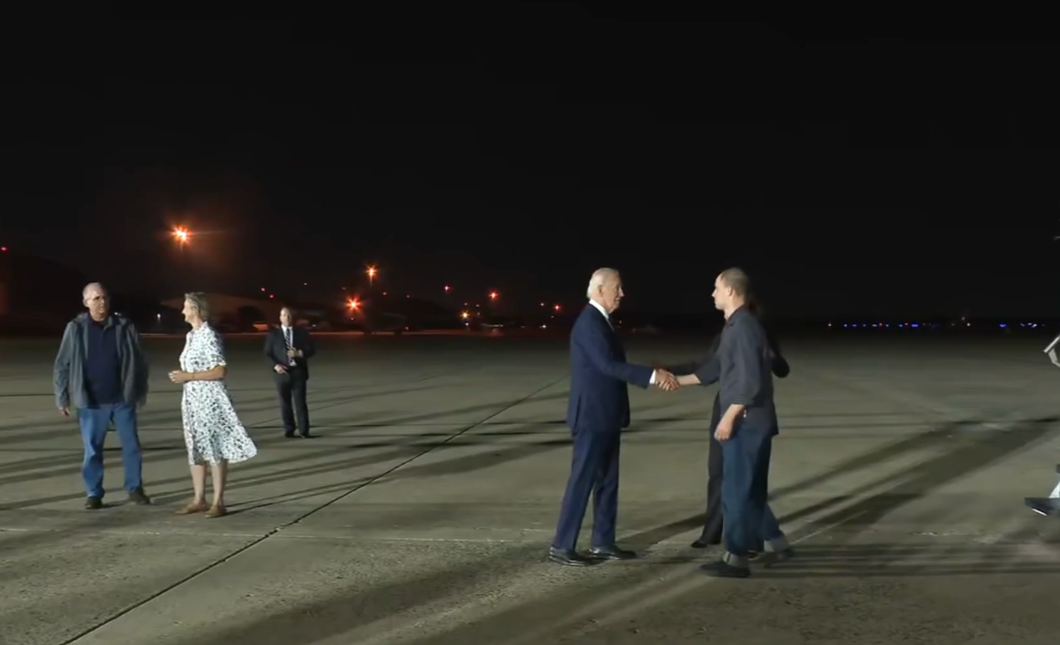 Biden, acompañado de la vicepresidenta, Kamala Harris, recibió a los periodistas Evan Gershkovich y Alsu Kurmasheva y el exinfante de marina Paul Whelan a los pies del avión que los traía desde Ankara (Turquía) en la Base Aérea de Andrews, en Maryland.