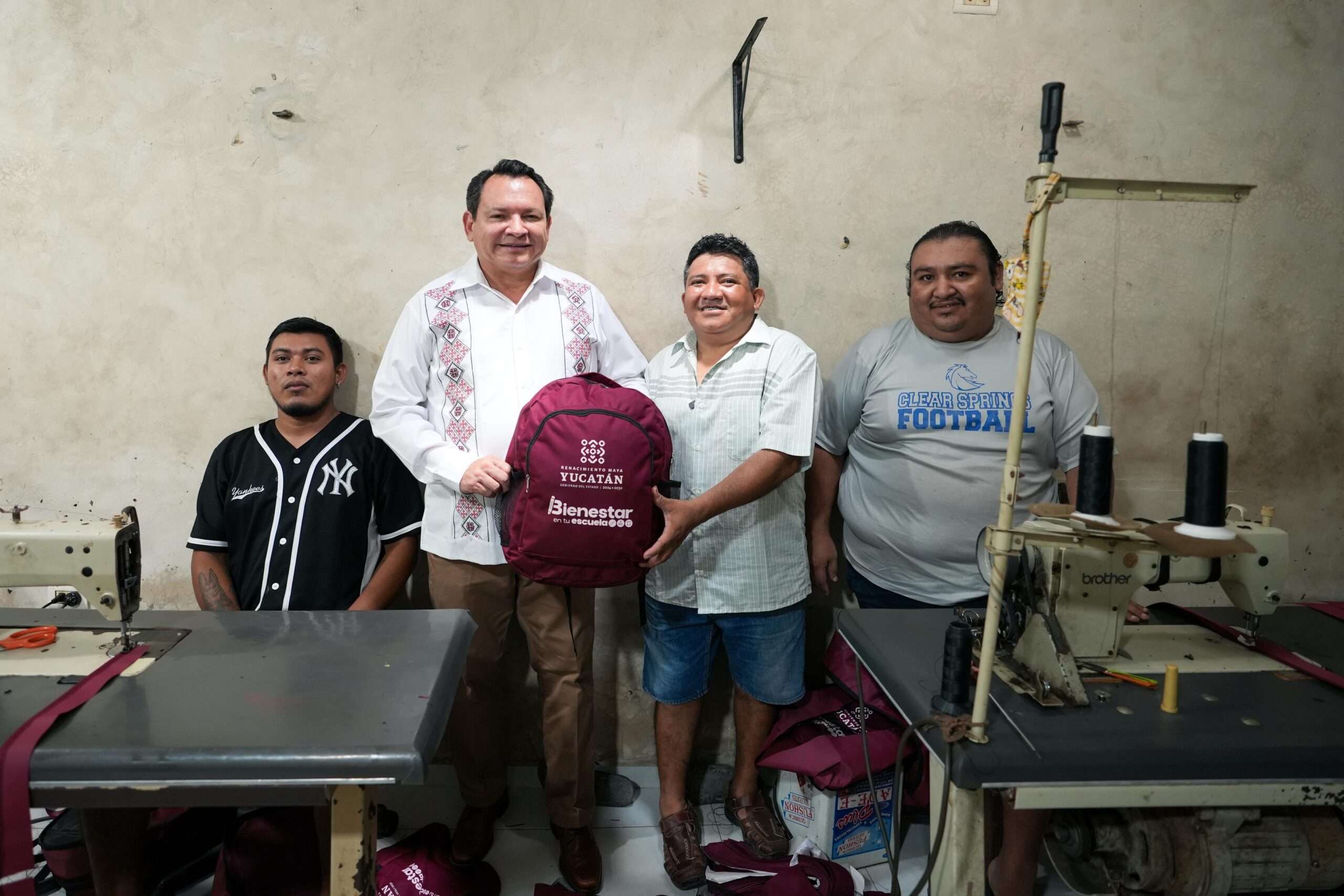 El Gobernador Joaquín Díaz Mena visitó el taller de Rolando Collí Huchim, artesano de 46 años con más de dos décadas de experiencia en la confección de mochilas, quien junto con más de 20 personas de esta comunidad, fueron los responsables de producir las mochilas del programa estatal.