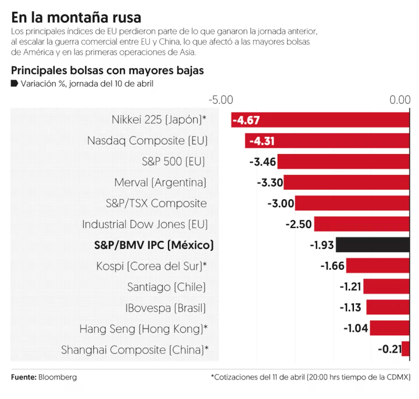 Los mercados accionarios sufrieron de nuevo fuertes caídas, ante el nerviosismo por el impacto que tendrá en la economía global la política arancelaria de Estados Unidos, principalmente por su disputa comercial con China.