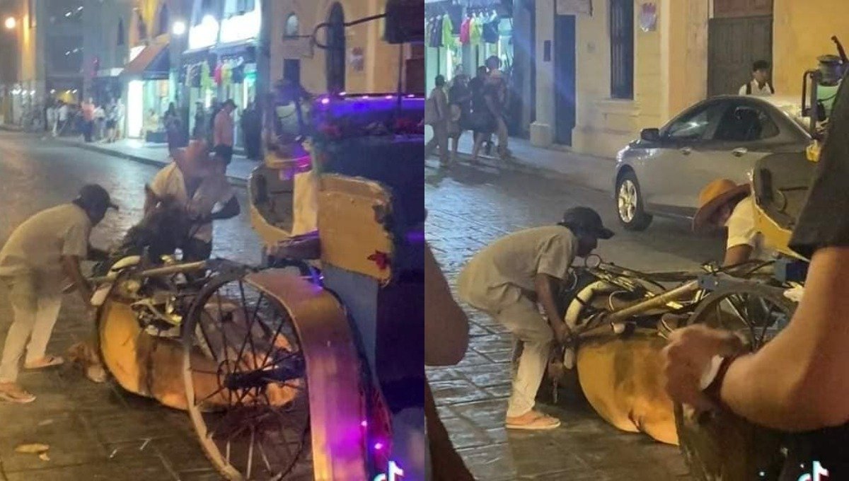 A través de TikTok se ha viralizado el video del momento en el que un caballo se desploma en el Centro Histórico de Mérida cuando jalaba de una calesa con turistas.