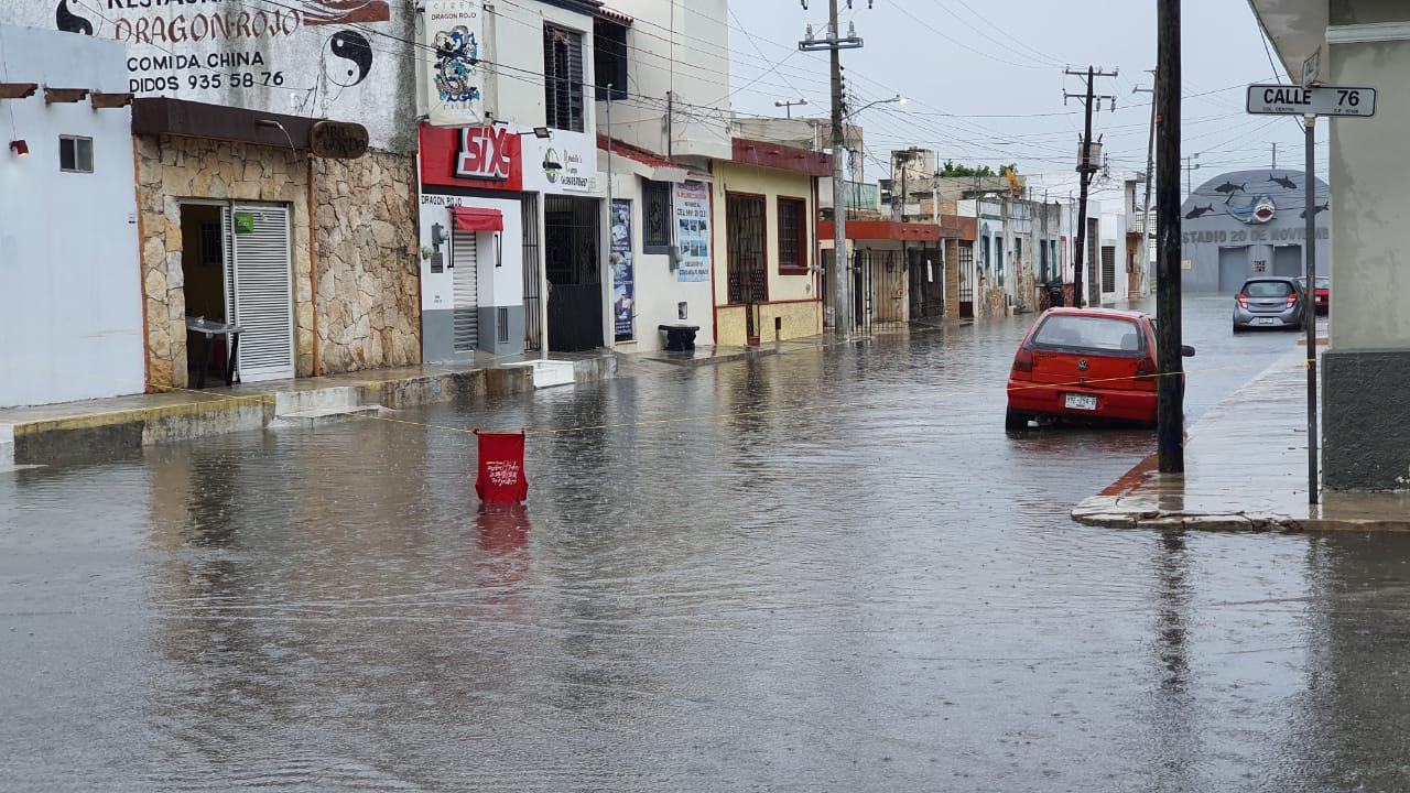 Una de las calles más inundadas en esta ciudad fue la céntrica 80, que va del distribuidor de entrada del puerto al malecón, sobre todo en la esquina de la 37, que colinda con la unidad deportiva 20 de Noviembre.