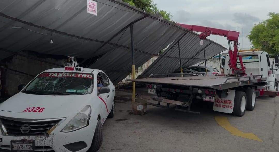 Cae techo metálico sobre autos en estacionamiento del centro de Mérida