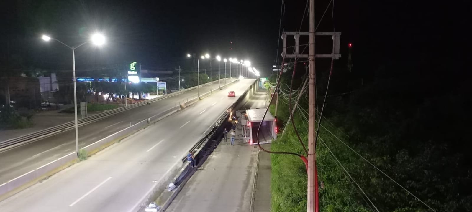 Un tráiler el cual era conducido con dirección a Tulum, volcó cuando subía el puente vehicular a la entrada de la delegación Puerto Aventuras, en Solidaridad, al parecer el conductor perdió el control hacia su extrema izquierda y cayó del paso a desnivel de una altura aproximadamente de dos metros, quedando en los carriles de baja.