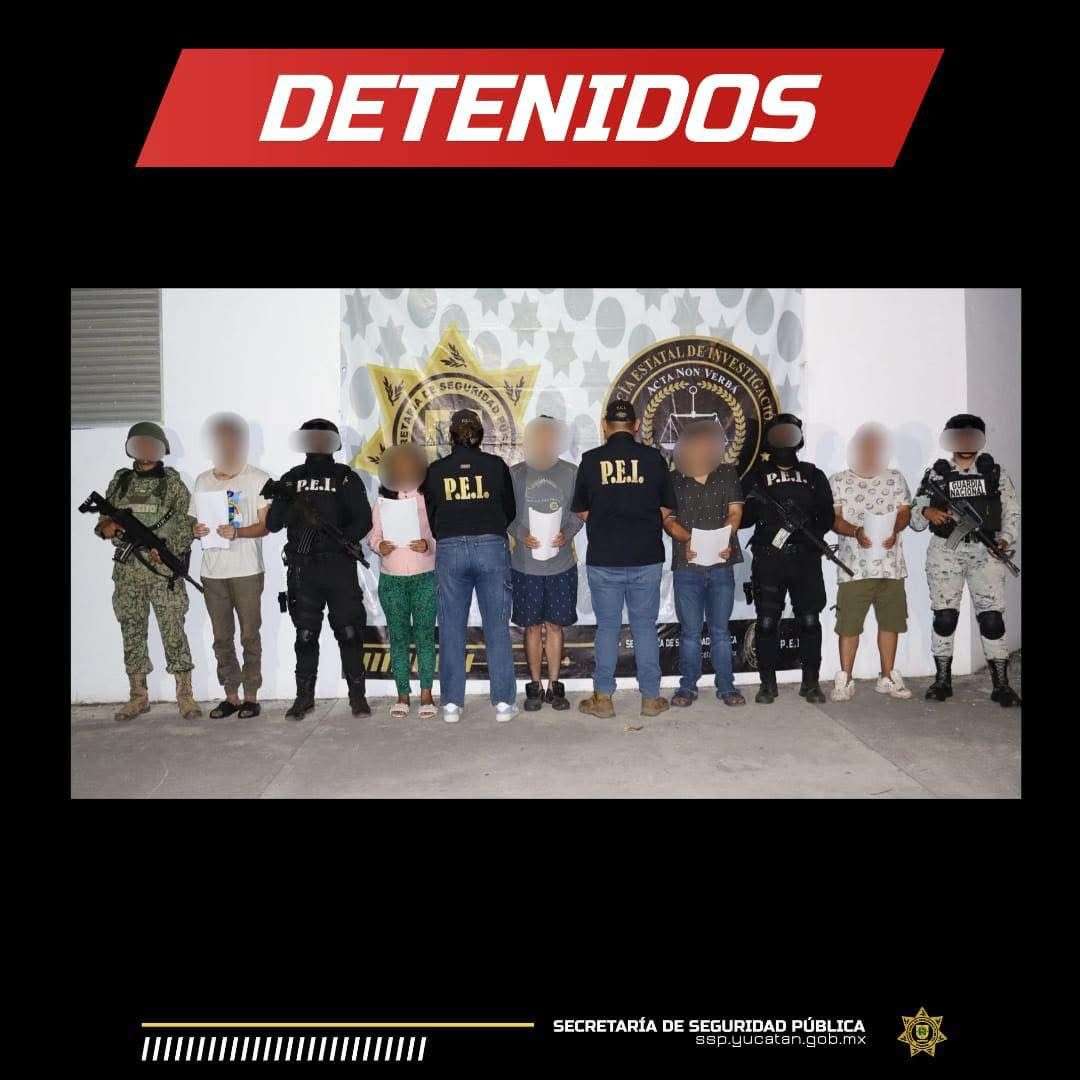 Las personas detenidas fueron identificadas como Luis Antonio “N”, de 63 años, originario de Chiapas; Alfredo “N”, de 34 años, de Ticul, Yucatán; Verónica Rubí “N”, de 32 años, de Chetumal, Quintana Roo; Carlos Alberto “N”, de 34 años, de Coatzacoalcos, Veracruz; y Keny Elías “N”, de 27 años, de Cancún, Quintana Roo.