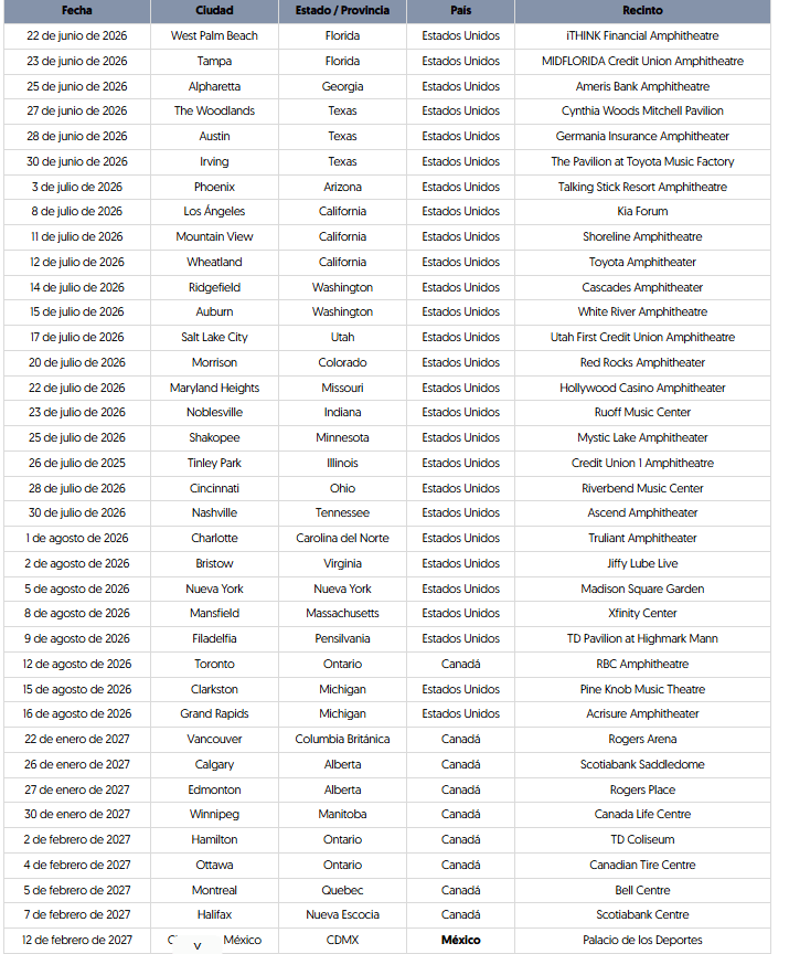 Su gira mundial de 37 fechas arranca el 22 de junio de 2026 en Florida (Estados Unidos); para septiembre se va a Irlanda; en octubre pasa por Australia; el 2027 lo inicia con Canadá y, finalmente, cierra con una única fecha en territorio mexicano.