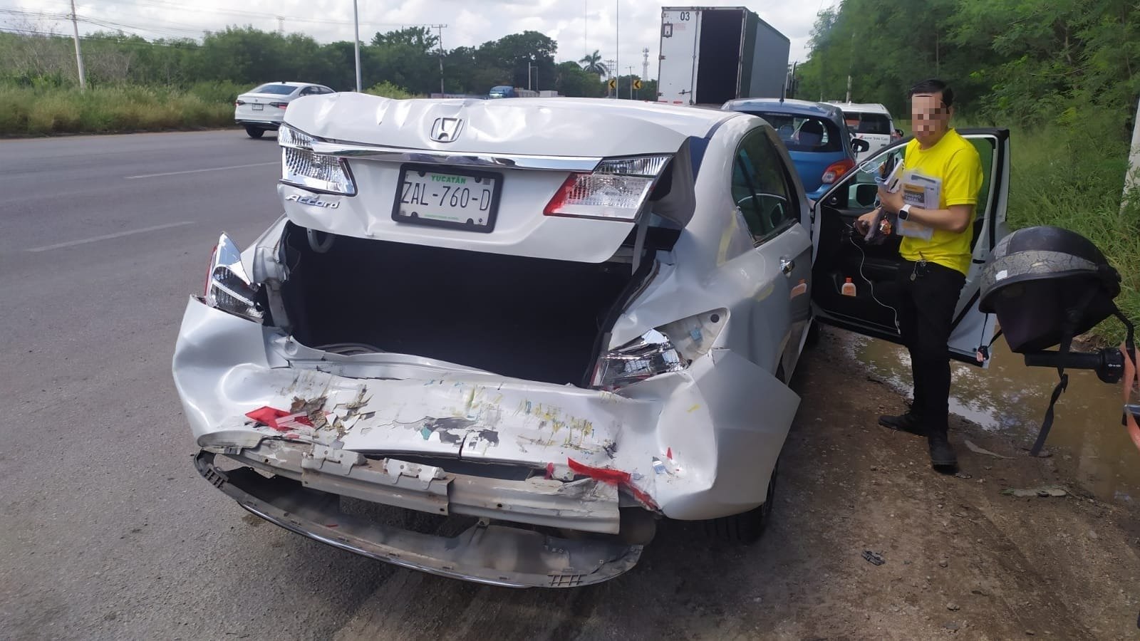 Un vehículo particular, modelo Nissan March, fue impactado por otro conductor que no habría medido correctamente su distancia; el golpe desencadenó una serie de colisiones continuas en el Periférico de Mérida.
