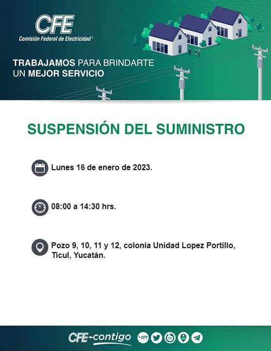 De acuerdo con lo publicado por la división peninsular de la Comisión Federal de Electricidad, la suspensión del suministro en la colonia Unidad López Portillo, en Ticul.