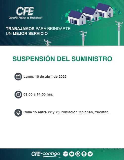 De acuerdo con lo publicado por la división peninsular de la Comisión Federal de Electricidad, la suspensión del suministro será en la población de Opichen.