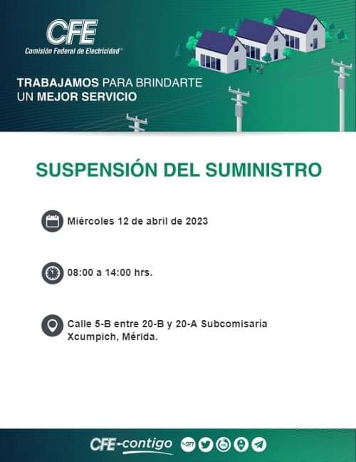 De acuerdo con lo publicado por la división peninsular de la Comisión Federal de Electricidad, la suspensión del suministro será en la sub comisaría de Xcumpich en Mérida, en la colonia Montebello y en Pedregales de Tanlum también en Mérida.
