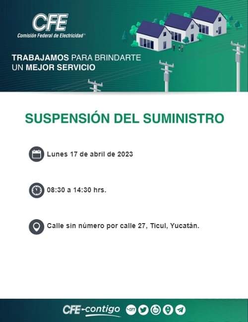 De acuerdo con lo publicado por la división peninsular de la Comisión Federal de Electricidad, la suspensión del suministro será en el municipio de Ticul, específicamente en la calle 27.