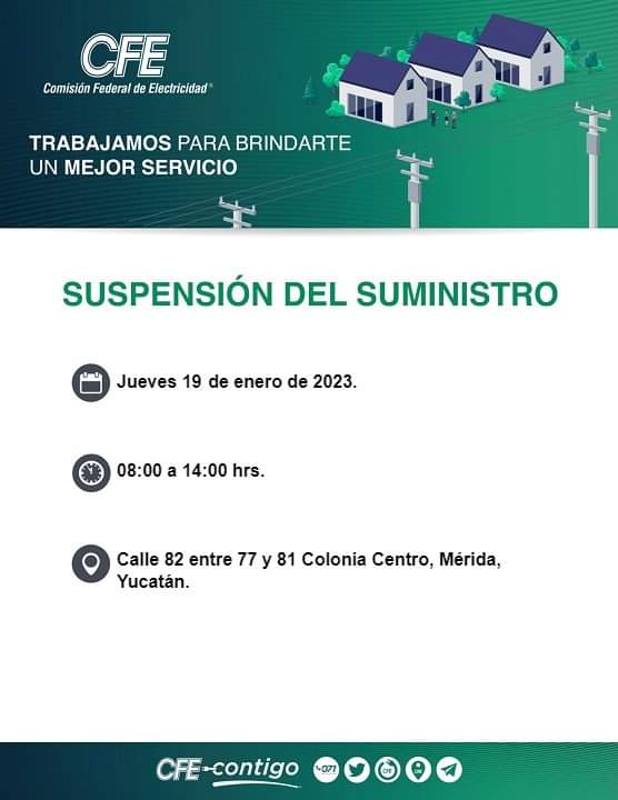 De acuerdo con lo publicado por la división peninsular de la Comisión Federal de Electricidad, la suspensión del suministro en la colonia Centro, y en la colonia Azcorra.