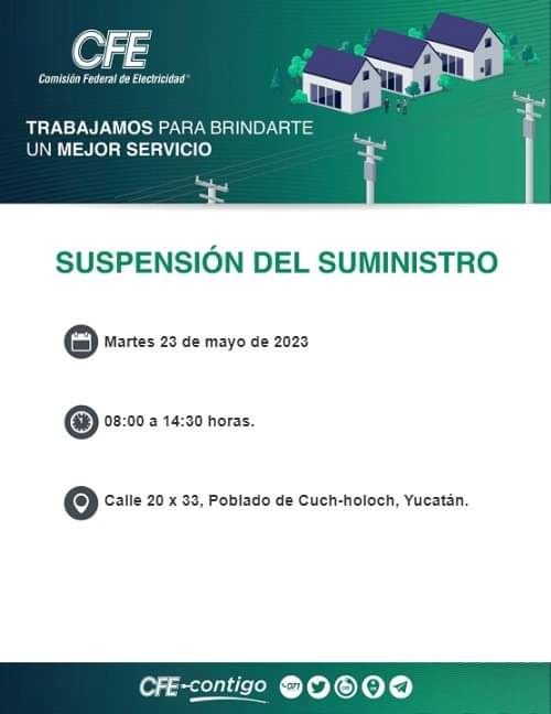 De acuerdo con lo publicado por la división peninsular de la Comisión Federal de Electricidad, la suspensión del suministro serán en municipios del interior del estado, específicamente en las siguientes colonias: