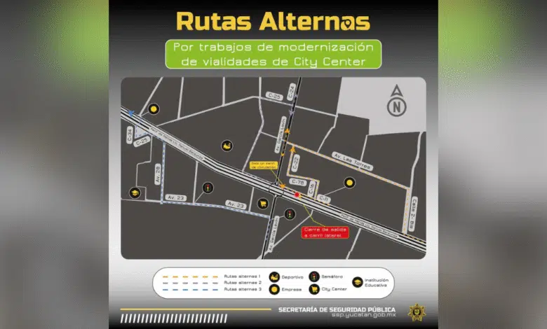 Los automovilistas que circulan por los carriles centrales de oriente a poniente deben tener en cuenta que la salida del distribuidor vial de City Center permanece cerrada, por lo que se recomienda incorporarse a la lateral y conectar con calle 25 hacia avenida 24. Por su parte, quienes transitan de sur a norte por avenida García Lavín pueden usar la ruta por avenida 23, avenida 61 y avenida 28 para incorporarse al periférico en calle 25 y acceder al distribuidor vial mediante calle 34.