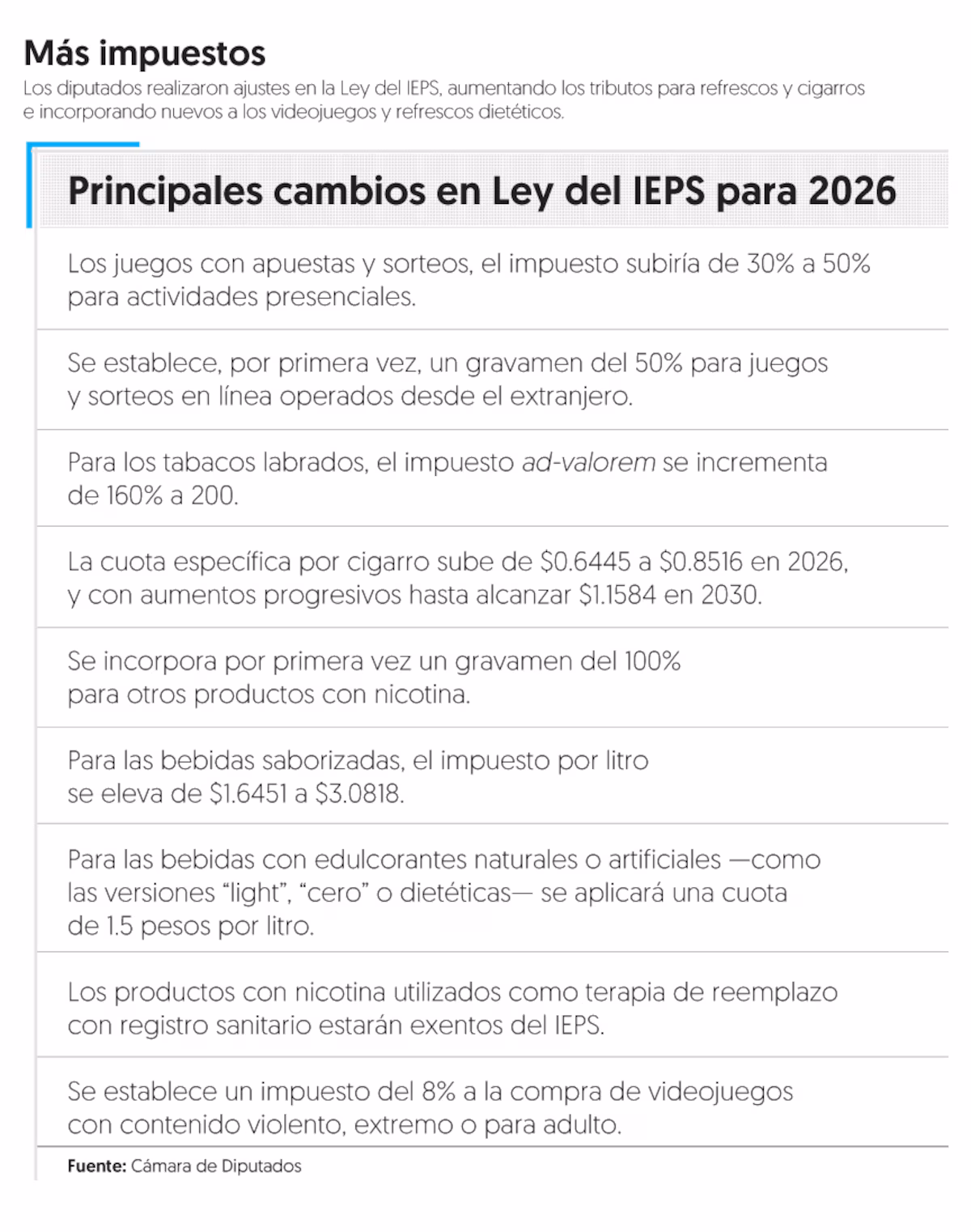 Con el voto mayoritario de Morena, del PT y del Partido Verde, la Cámara de Diputados aprobó ayer la Ley del Impuesto Especial sobre Producción y Servicios (IEPS) de 2026, que avala el aumento y la creación de nuevos impuestos, que aportarán 761 mil 318 millones de pesos al fisco.