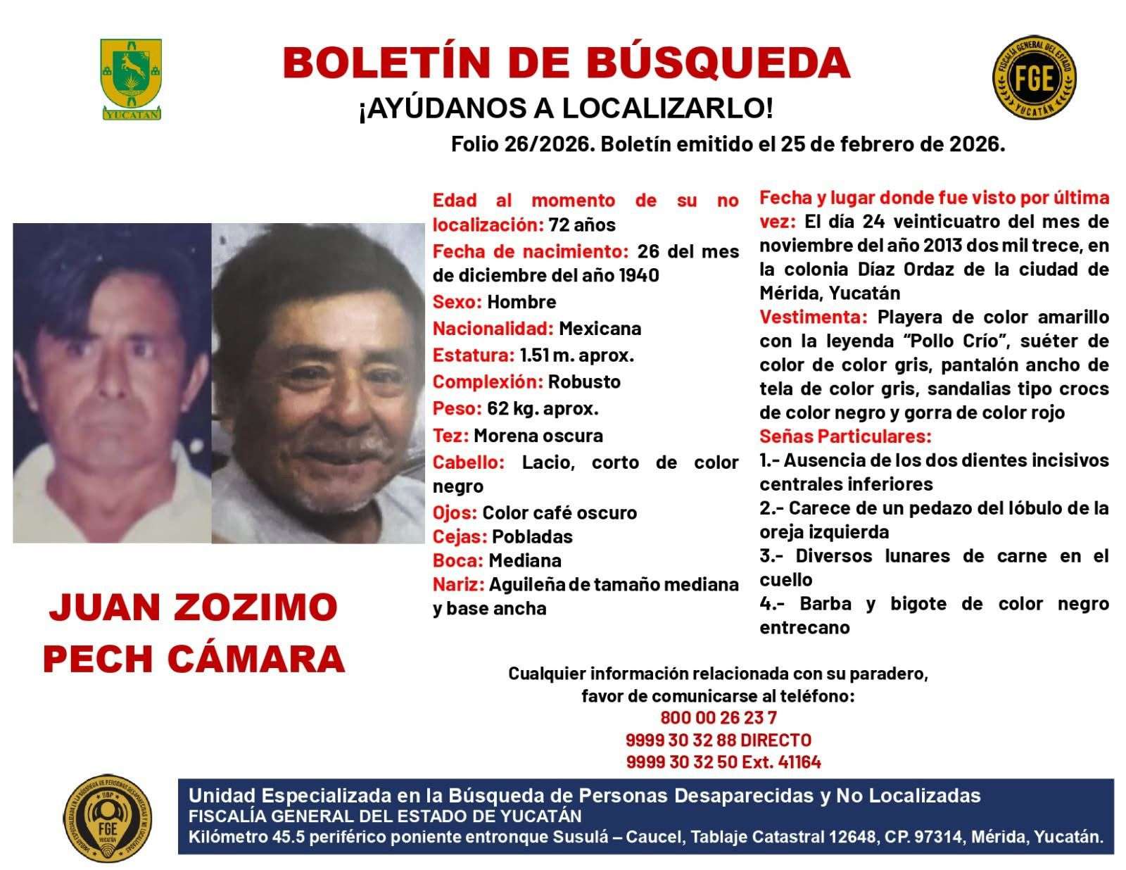 El día de su desaparición vestía playera amarilla con la leyenda “Pollo Crío”, suéter gris, pantalón gris ancho de tela, sandalias tipo crocs negras y gorra roja.