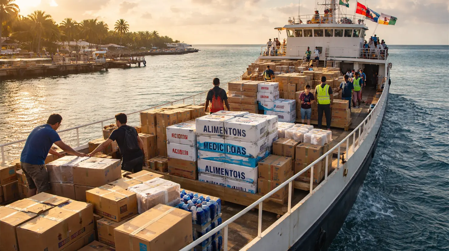 La embarcación transporta cerca de 30 toneladas de ayuda humanitaria, enfocada en cubrir necesidades básicas que actualmente presentan escasez en la isla.