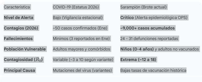 A principios de 2026, la situación epidemiológica en México presenta un contraste importante: mientras el COVID-19 se mantiene en niveles de control (aunque persistente), el sarampión atraviesa un brote crítico que ha puesto al país en alerta máxima.