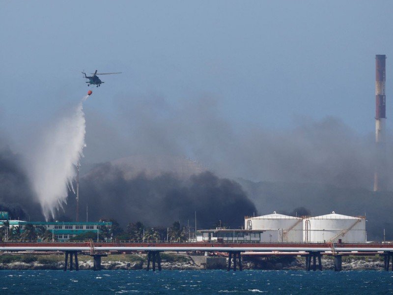 Helicópteros cisterna se abren paso entre la humareda para tratar de extinguir el incendio en Matanzas; México ha enviado a la isla 13 vuelos de ayuda y un buque de apoyo logístico.