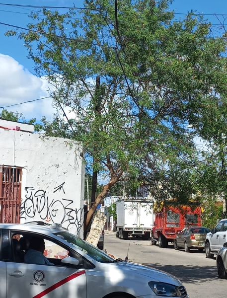 El movimiento del árbol, que quedó sobre la barda, también ocasionó que “jalara” los cables del tendido eléctrico y de otros servicios de la zona, lo que representa un riesgo para transeúntes y vehículos.