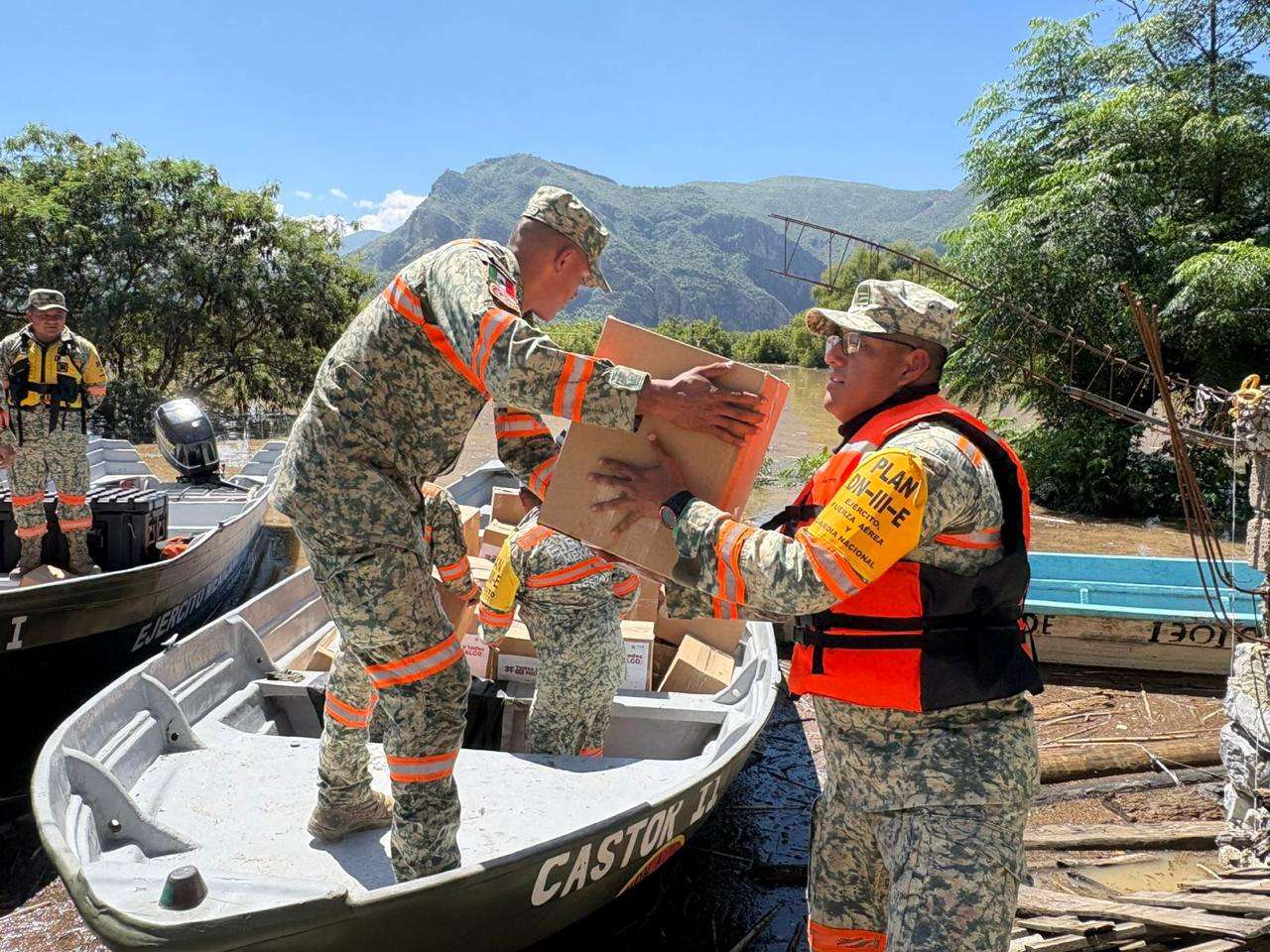 Con 2,179 efectivos y 4 helicópteros, las fuerzas armadas han trasladado 13,305 despensas y 45,438 litros de agua, además de evacuar a 38 personas en tres municipios. Se habilitaron 6 albergues con capacidad para 1,871 personas y se llevaron a cabo labores de limpieza de más de 14,300 m³ de lodo y tierra. También operan una planta potabilizadora, hospital militar, cocina móvil y drones de reconocimiento.
