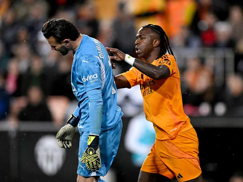 Vinicius Junior, delantero del Real Madrid, fue expulsado contra el Valencia, en el duelo aplazado de la jornada 12 de LaLiga EA Sports, por golpear al portero rival en la cabeza, siendo después sujetado entre sus protestas como recoge el acta arbitral, una conducta que le expone a una sanción grave.