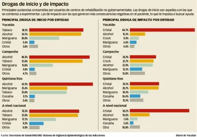 En cuanto a drogas de impacto, la primera en Yucatán es, como ya señalamos, el cristal, con 64.7 por ciento de los que se acercaron a los centros de tratamiento para solicitar ayuda.